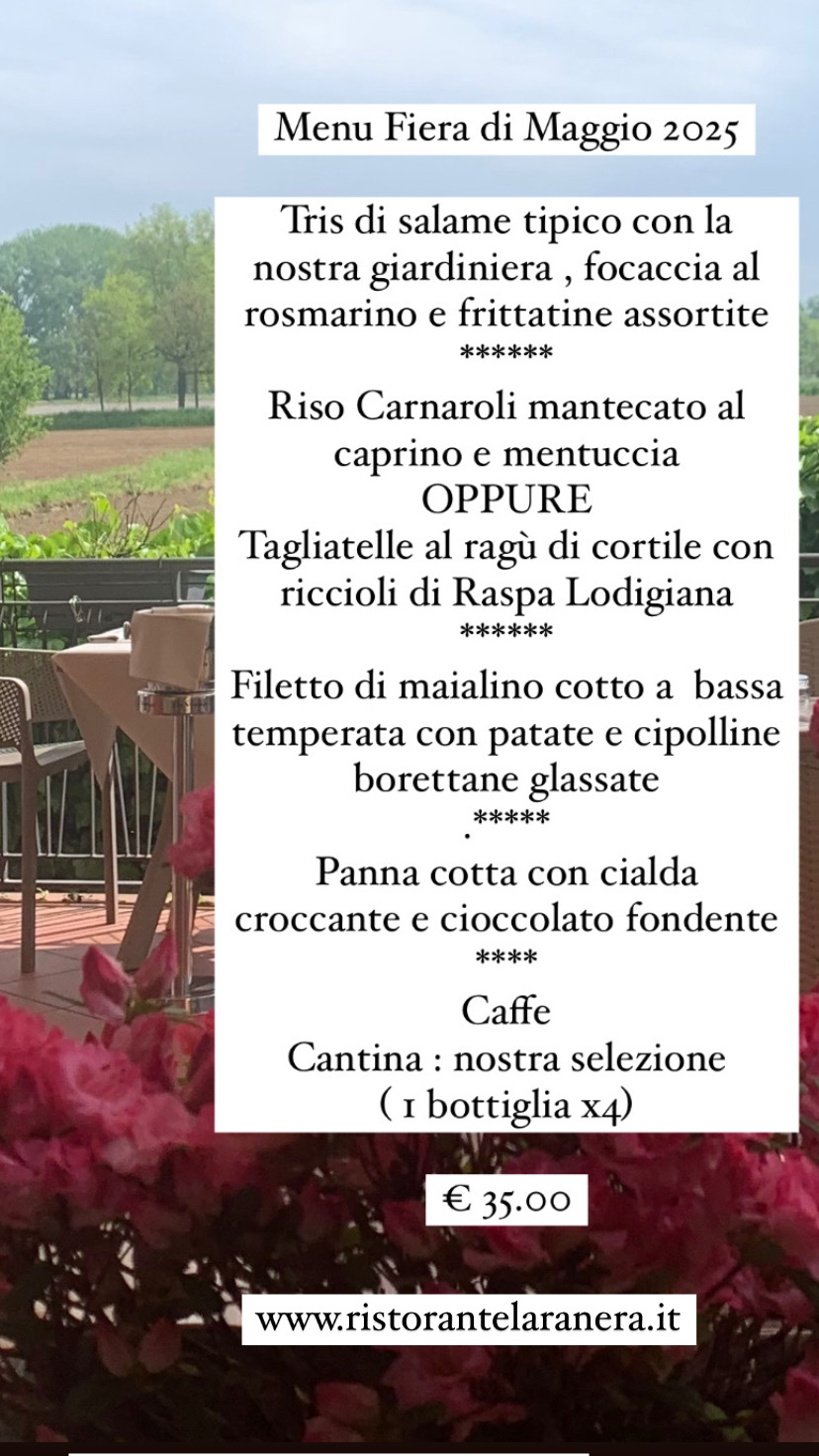 Menu disponibile la Domenica , nei mesi di Maggio e Giugno . In questa occasione se siete amanti delle passeggiate in bici, potrete usufruire della panoramica e nuovissima pista ciclabile che unisce la nostra frazione al paese di Sant’Angelo lodigiano ( 5 km circa) dove visita al castello Morando Bolognini ,musei e mostre di pittura potranno dilettare le vostre giornate .