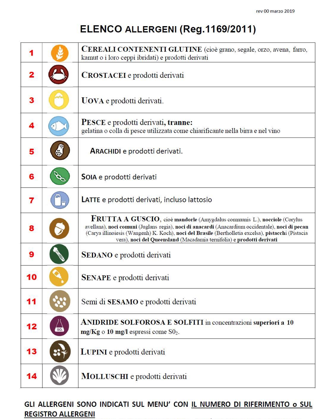 Il personale adeguatamente formato in merito fornirà su richiesta l’elenco dei principali tipi di allergeni eventualmente contenuti nei nostri menu.